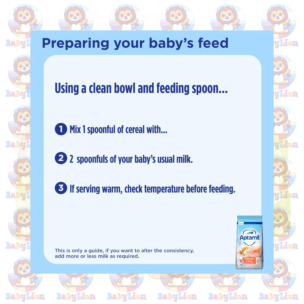 | Directions | Mix 1 spoonful of cereal with 2 spoonfuls of your baby’s usual milk. If serving warm, check temperature before feeding. Adjust the consistency by adding more or less milk as required. |
