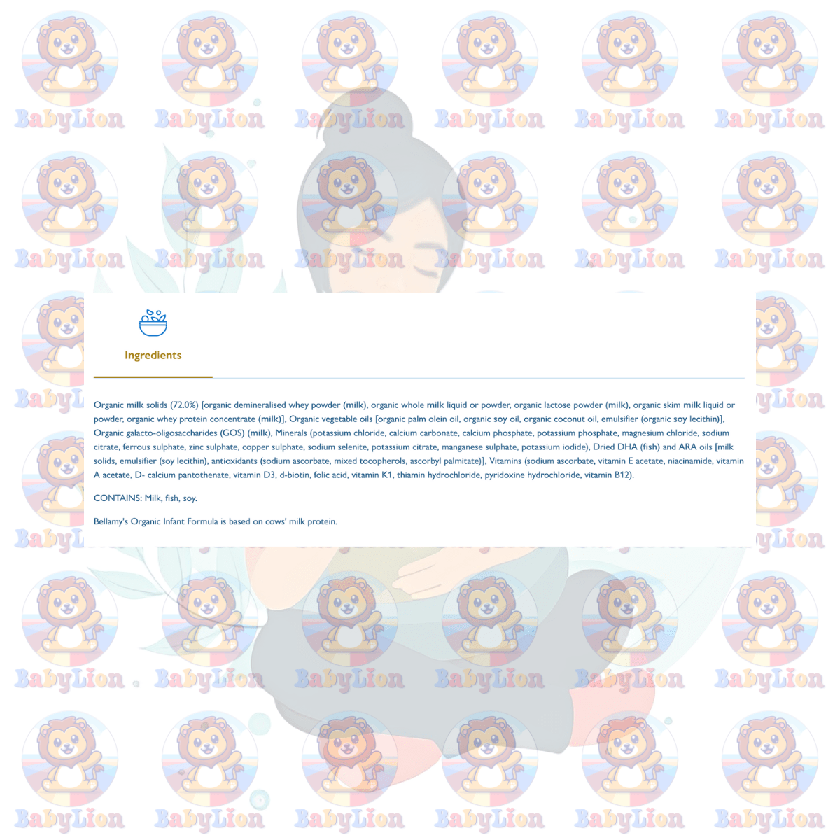 - Nutritionally Complete:Â Bellamy's Organic Step 1 Infant Formula offers a comprehensive nutritional profile that meets the dietary needs of infants from birth to 6 months.