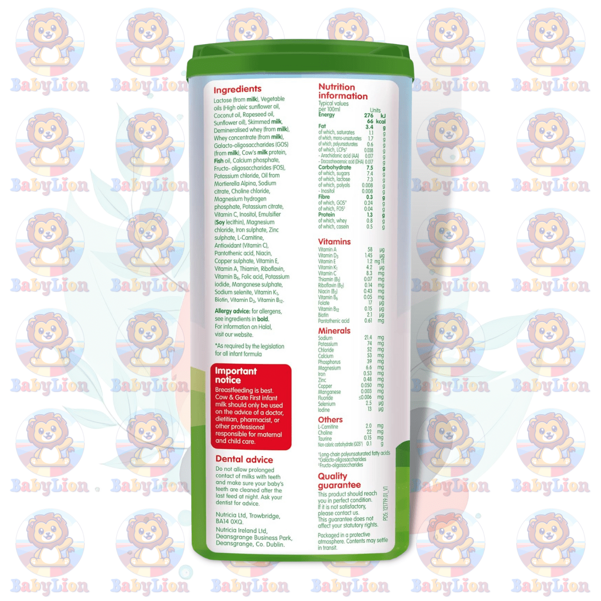 | Ingredients | Lactose (from MILK), Vegetable Oils (High Oleic Sunflower Oil, Coconut Oil, Rapeseed Oil, Sunflower Oil), Skimmed MILK, Demineralised Whey (from MILK), Whey Concentrate (from MILK), Galacto-Oligosaccharides (GOS) (from MILK), Cow’s MILK Protein, FISH Oil, Calcium Phosphate, Fructo- Oligosaccharides (FOS), Potassium Chloride, Oil from Mortierella Alpina, Sodium Citrate, Choline Chloride, Magnesium Hydrogen Phosphate, Potassium Citrate, Vitamin C, Inositol, Emulsifier (SOY Lecithin), Magnesium Chloride, Iron Sulphate, Zinc Sulphate, L-Carnitine, Antioxidant (Vitamin C), Pantothenic Acid, Niacin, Copper Sulphate, Vitamin E, Vitamin A, Thiamin, Riboflavin, Vitamin B6, Folic Acid, Potassium Iodide, Manganese Sulphate, Sodium Selenite, Vitamin K1, Biotin, Vitamin D3, Vitamin B12 |