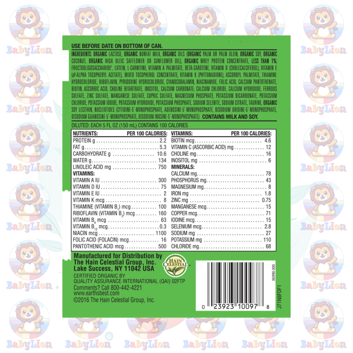 | Ingredients | Organic Lactose, Organic Nonfat Milk, Organic Oils (Organic Palm Or Palm Olein, Organic Soy, Organic Coconut, Organic High Oleic Safflower Or Sunflower Oil), Organic Whey Protein Concentrate, less than 1%: Fructooligosaccharide, Lutein, L-Carnitine, Vitamin A Palmitate, Beta-Carotene, Vitamin D (Cholecalciferol), Vitamin E (Dl-Alpha Tocopheryl Acetate), Mixed Tocopherol Concentrate, Vitamin K (Phytonadione), Ascorbyl Palmitate, Thiamine Hydrochloride, Riboflavin, Pyridoxine Hydrochloride, Cyanocobalamin, Niacinamide, Folic Acid, Calcium Pantothenate, Biotin, Ascorbic Acid, Choline Bitartrate, Inositol, Calcium Carbonate, Calcium Chloride, Calcium Hydroxide, Ferrous Sulfate, Zinc Sulfate, Manganese Sulfate, Cupric Sulfate, Magnesium Phosphate, Potassium Bicarbonate, Potassium Chloride, Potassium Iodide, Potassium Hydroxide, Potassium Phosphate, Sodium Selenite, Sodium Citrate, Taurine, Organic Soy Lecithin, Nucleotides (Cytidine-5′-Monophosphate, Adenosine-5′-Monophosphate, Disodium Uridine-5′-Monophosphate, Disodium Guanosine-5′-Monophosphate, Disodium Inosine-5′-Monophosphate) |