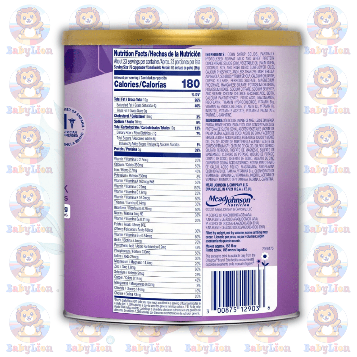 | Ingredients | Corn Syrup Solids, Partially Hydrolyzed Nonfat Milk And Whey Protein Concentrate Solids (Soy), Vegetable Oil (Palm Olein, Coconut, Soy, And High Oleic Sunflower Oils), 2’-FUCOSYLLACTOSE, Mortierella Alpina Oil, Schizochytrium Sp. Oil, Calcium Carbonate, Sodium Citrate, Calcium Phosphate, Potassium Chloride, Magnesium Phosphate, Ferrous Sulfate, Zinc Sulfate, Cupric Sulfate, Manganese Sulfate, Potassium Iodide, Sodium Selenite, Choline Chloride, Inositol, Ascorbic Acid, Niacinamide, Calcium Pantothenate, Riboflavin, Thiamin Hydrochloride, Vitamin D3, Vitamin B6 Hydrochloride, Folic Acid, Vitamin K1, Biotin, Vitamin B12, Vitamin E Acetate, Vitamin A Palmitate, SOY LECITHIN, Taurine, L-carnitine. |