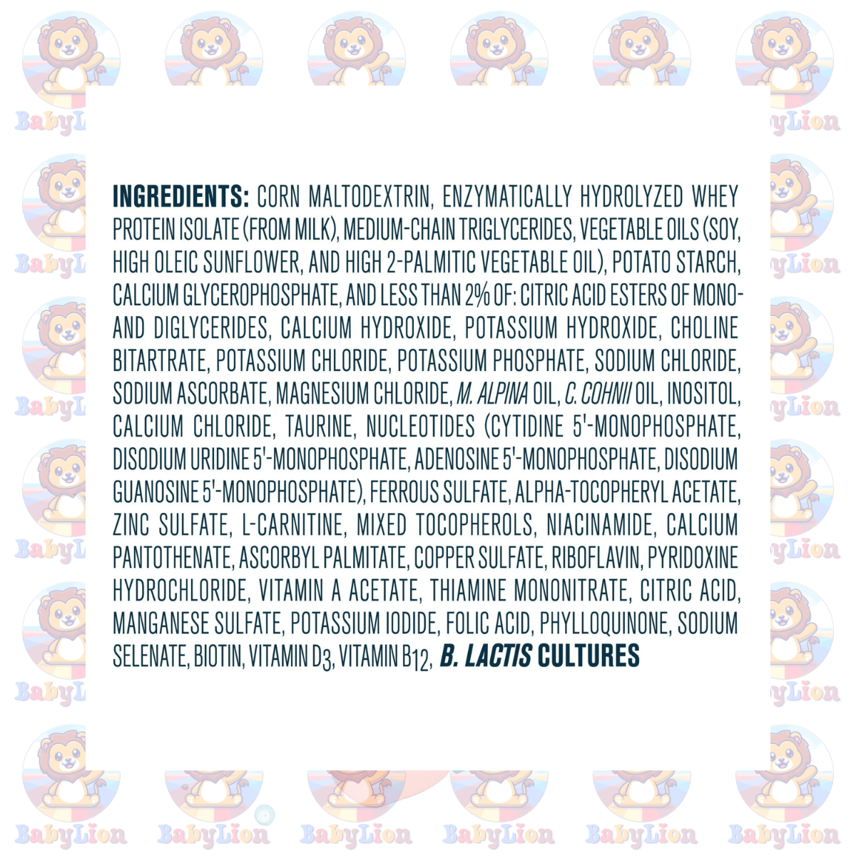 | Ingredients | CORN MALTODEXTRIN, ENZYMATICALLY HYDROLYZED WHEY PROTEIN ISOLATE (FROM MILK), MEDIUM-CHAIN TRIGLYCERIDES, VEGETABLE OILS (SOY, HIGH OLEIC SUNFLOWER, AND HIGH 2-PALMITIC VEGETABLE OIL), POTATO STARCH, CALCIUM GLYCEROPHOSPHATE, AND LESS THAN 2% OF: CITRIC ACID ESTERS OF MONO- AND DIGLYCERIDES, CALCIUM HYDROXIDE, POTASSIUM HYDROXIDE, CORN SYRUP SOLIDS, CHOLINE BITARTRATE, POTASSIUM CHLORIDE, POTASSIUM PHOSPHATE, SODIUM CHLORIDE, SODIUM ASCORBATE, MAGNESIUM CHLORIDE, M. ALPINA OIL, C. COHNII OIL, INOSITOL, CALCIUM CHLORIDE, TAURINE, NUCLEOTIDES (CYTIDINE 5′-MONOPHOSPHATE, DISODIUM URIDINE 5′-MONOPHOSPHATE, ADENOSINE 5′-MONOPHOSPHATE, DISODIUM GUANOSINE 5′-MONOPHOSPHATE), FERROUS SULFATE, ALPHA-TOCOPHERYL ACETATE, ZINC SULFATE, L-CARNITINE, MIXED TOCOPHEROLS, NIACINAMIDE, CALCIUM PANTOTHENATE, ASCORBYL PALMITATE, COPPER SULFATE, RIBOFLAVIN, PYRIDOXINE HYDROCHLORIDE, VITAMIN A ACETATE, THIAMINE MONONITRATE, CITRIC ACID, MANGANESE SULFATE, POTASSIUM IODIDE, FOLIC ACID, PHYLLOQUINONE, SODIUM SELENATE, BIOTIN, VITAMIN D3, VITAMIN B12, B. LACTIS CULTURES |