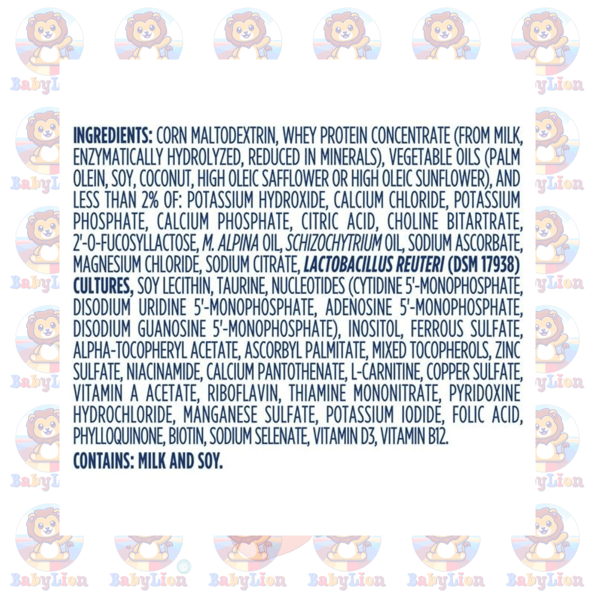 | Ingredients | Corn Maltodextrin, Hydrolyzed Whey Protein Concentrate, Vegetable Oils, Less than 2%: Potassium Hydroxide, Calcium Chloride, Calcium Phosphate, Potassium Phosphate, Sodium Ascorbate, Sodium Citrate, Choline Bitartrate, 2′-O-Fucosyllactose, M Alpina Oil, C Cohnii Oil, Citric Acid, Magnesium Chloride, Taurine, Nucleotides, Inositol, Ferrous Sulfate, Alpha-Tocopheryl Acetate, Mixed Tocopherols, Ascorbyl Palmitate, Zinc Sulfate, Niacinamide, Calcium Pantothenate, L-Carnitine, Copper Sulfate, Vitamin A Acetate, Thiamine Mononitrate, Riboflavin, Pyridoxine Hydrochloride, Manganese Sulfate, Potassium Iodide, Folic Acid, Phylloquinone, Biotin, Sodium Selenate, Vitamin D3, Vitamin B12, Soy Lecithin, Lactobacillus Reuteri Cultures |