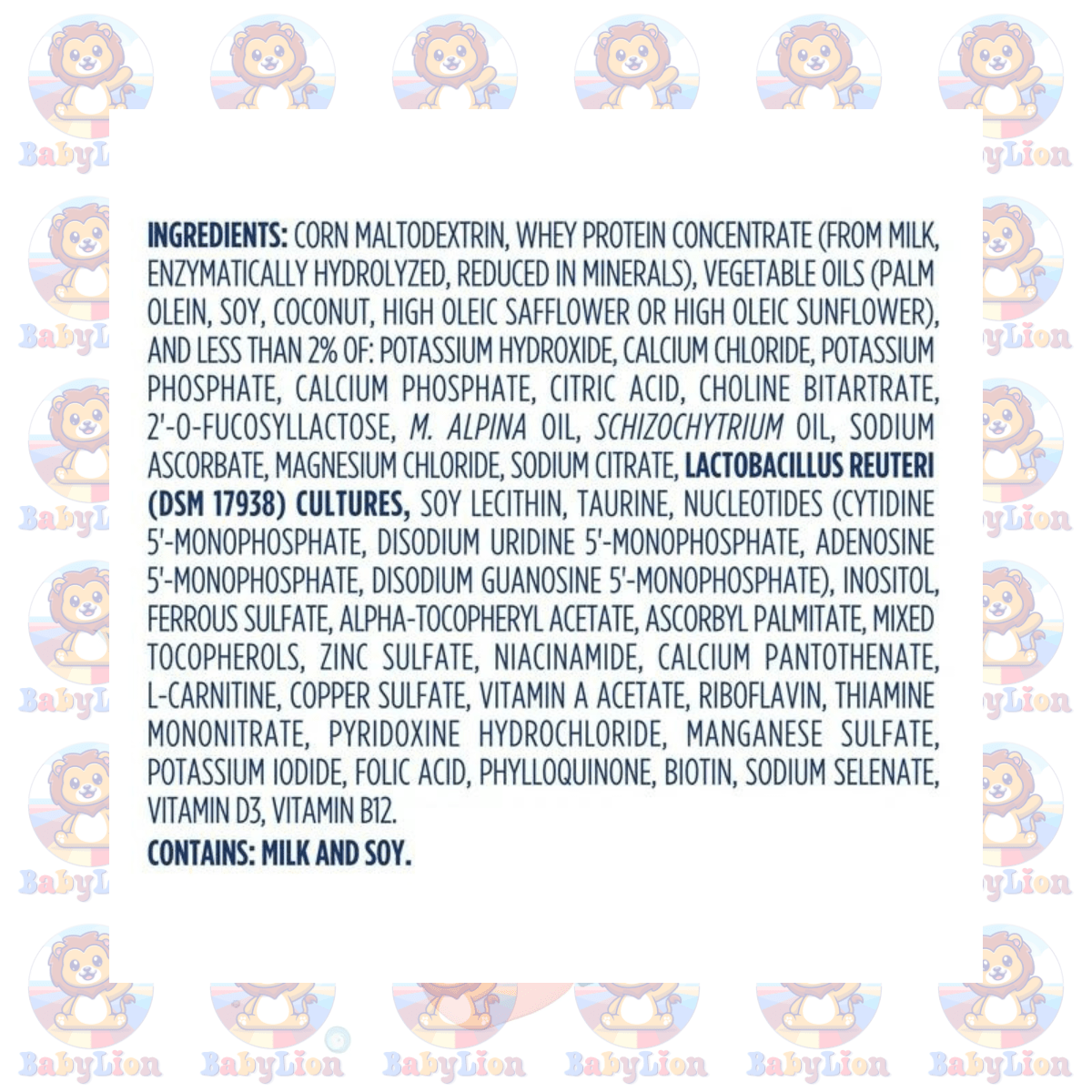 | Ingredients | Corn Maltodextrin, Hydrolyzed Whey Protein Concentrate, Vegetable Oils, Less than 2%: Potassium Hydroxide, Calcium Chloride, Calcium Phosphate, Potassium Phosphate, Sodium Ascorbate, Sodium Citrate, Choline Bitartrate, 2′-O-Fucosyllactose, M Alpina Oil, C Cohnii Oil, Citric Acid, Magnesium Chloride, Taurine, Nucleotides, Inositol, Ferrous Sulfate, Alpha-Tocopheryl Acetate, Mixed Tocopherols, Ascorbyl Palmitate, Zinc Sulfate, Niacinamide, Calcium Pantothenate, L-Carnitine, Copper Sulfate, Vitamin A Acetate, Thiamine Mononitrate, Riboflavin, Pyridoxine Hydrochloride, Manganese Sulfate, Potassium Iodide, Folic Acid, Phylloquinone, Biotin, Sodium Selenate, Vitamin D3, Vitamin B12, Soy Lecithin, Lactobacillus Reuteri Cultures |