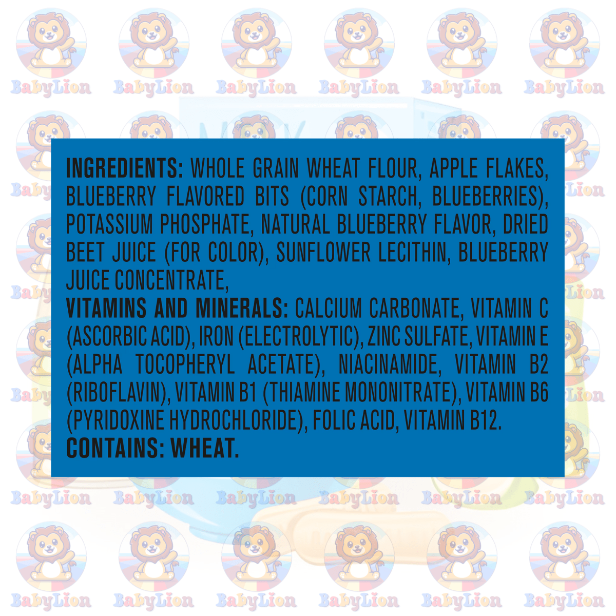 | Ingredients | WHOLE GRAIN WHEAT FLOUR, APPLE FLAKES, BLUEBERRY FLAVORED BITS (CORN STARCH, BLUEBERRIES), POTASSIUM PHOSPHATE, NATURAL BLUEBERRY FLAVOR, DRIED BEET JUICE (FOR COLOR), SUNFLOWER LECITHIN, BLUEBERRY JUICE CONCENTRATE, VITAMINS AND MINERALS (CALCIUM CARBONATE, VITAMIN C (ASCORBIC ACID), IRON (ELECTROLYTIC), ZINC SULFATE, VITAMIN E (ALPHA TOCOPHERYL ACETATE), NIACINAMIDE, VITAMIN B2 (RIBOFLAVIN), VITAMIN B1 (THIAMINE MONONITRATE), VITAMIN B6 (PYRIDOXINE HYDROCHLORIDE), FOLIC ACID, VITAMIN B12). |