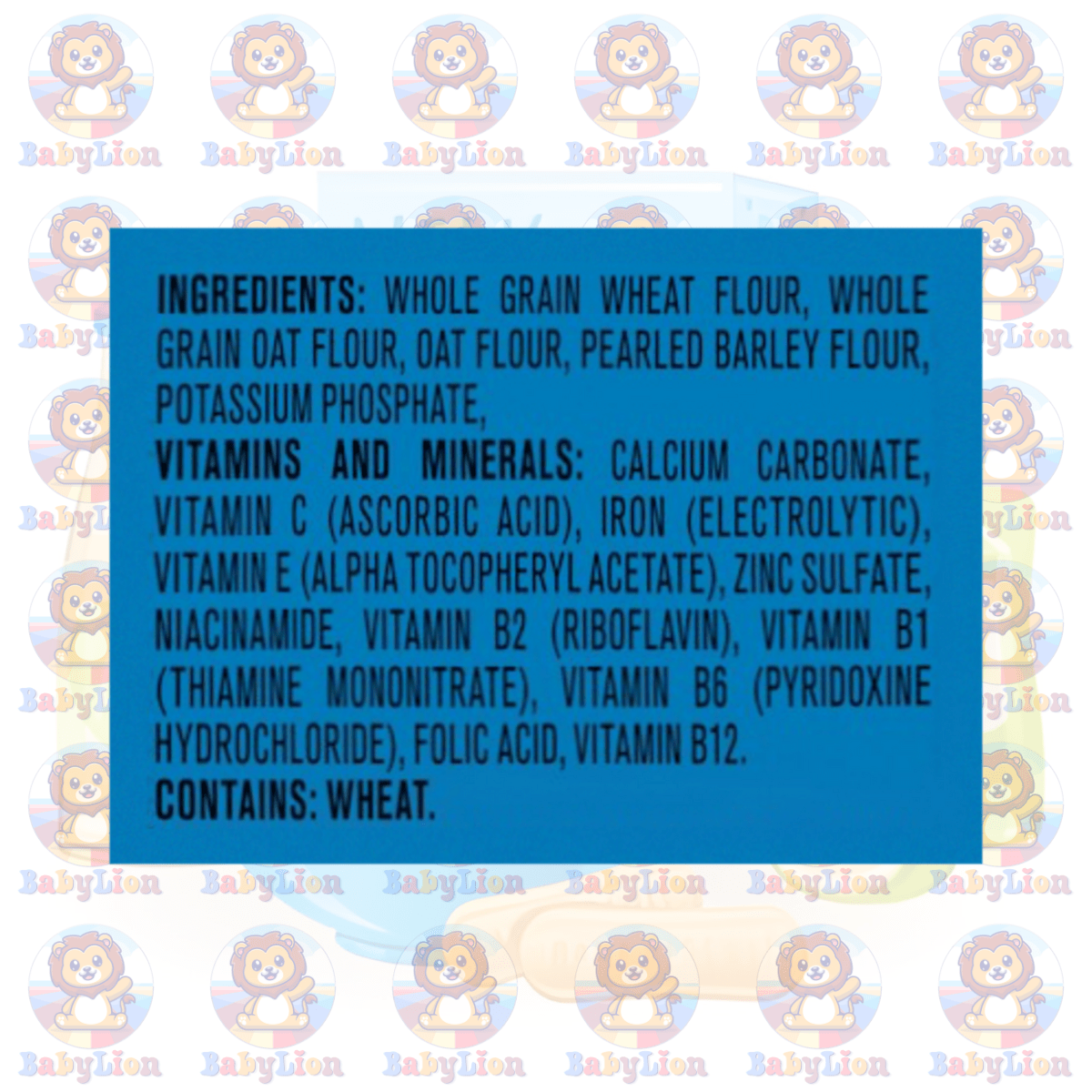 | Ingredients | WHOLE GRAIN WHEAT FLOUR, WHOLE GRAIN OAT FLOUR, OAT FLOUR, RICE FLOUR, WHOLE GRAIN RYE FLOUR, PEARLED BARLEY FLOUR, POTASSIUM PHOSPHATE, VITAMINS AND MINERALS: CALCIUM CARBONATE, VITAMIN C (ASCORBIC ACID), IRON (ELECTROLYTIC), ZINC SULFATE, VITAMIN E (ALPHA TOCOPHERYL ACETATE), NIACINAMIDE, VITAMIN B2 (RIBOFLAVIN), VITAMIN B1 (THIAMIN MONONITRATE), VITAMIN B6 (PYRIDOXINE HYDROCHLORIDE), VITAMIN B12, FOLIC ACID. |