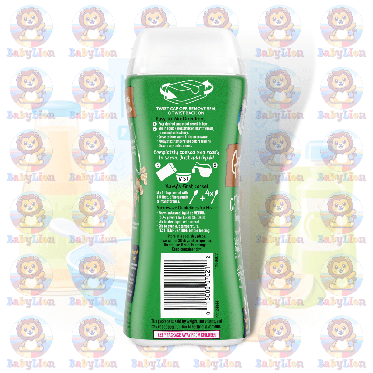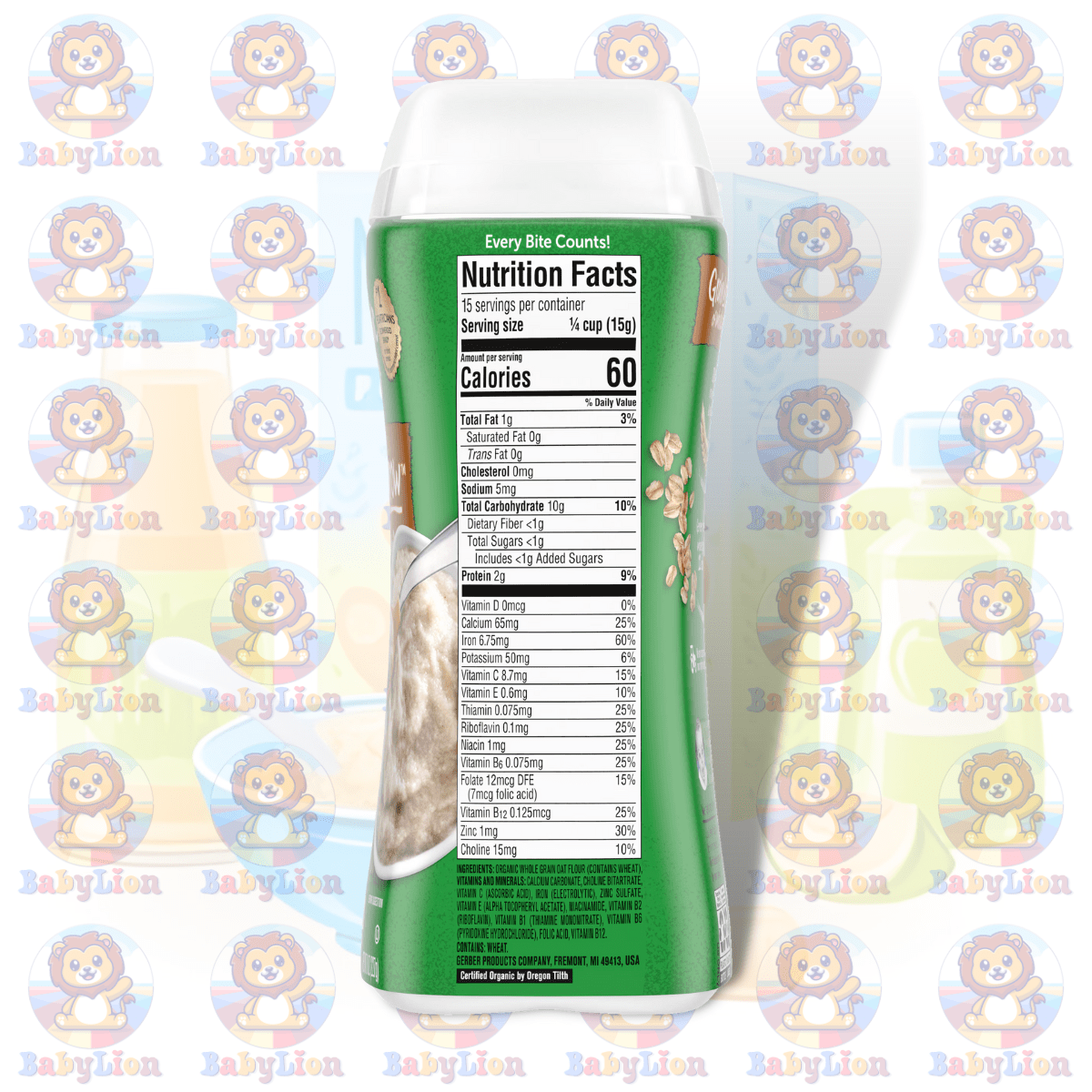 In every 227g container, Gerber combines organic whole grain oat flour with a blend of vital nutrients including Calcium, Iron, Vitamin C, and B Vitamins. This meticulous combination ensures that your baby receives the necessary components for strong bones, teeth, and a brilliant mind. Quality and quantity go hand in hand to offer your baby the best start in life.