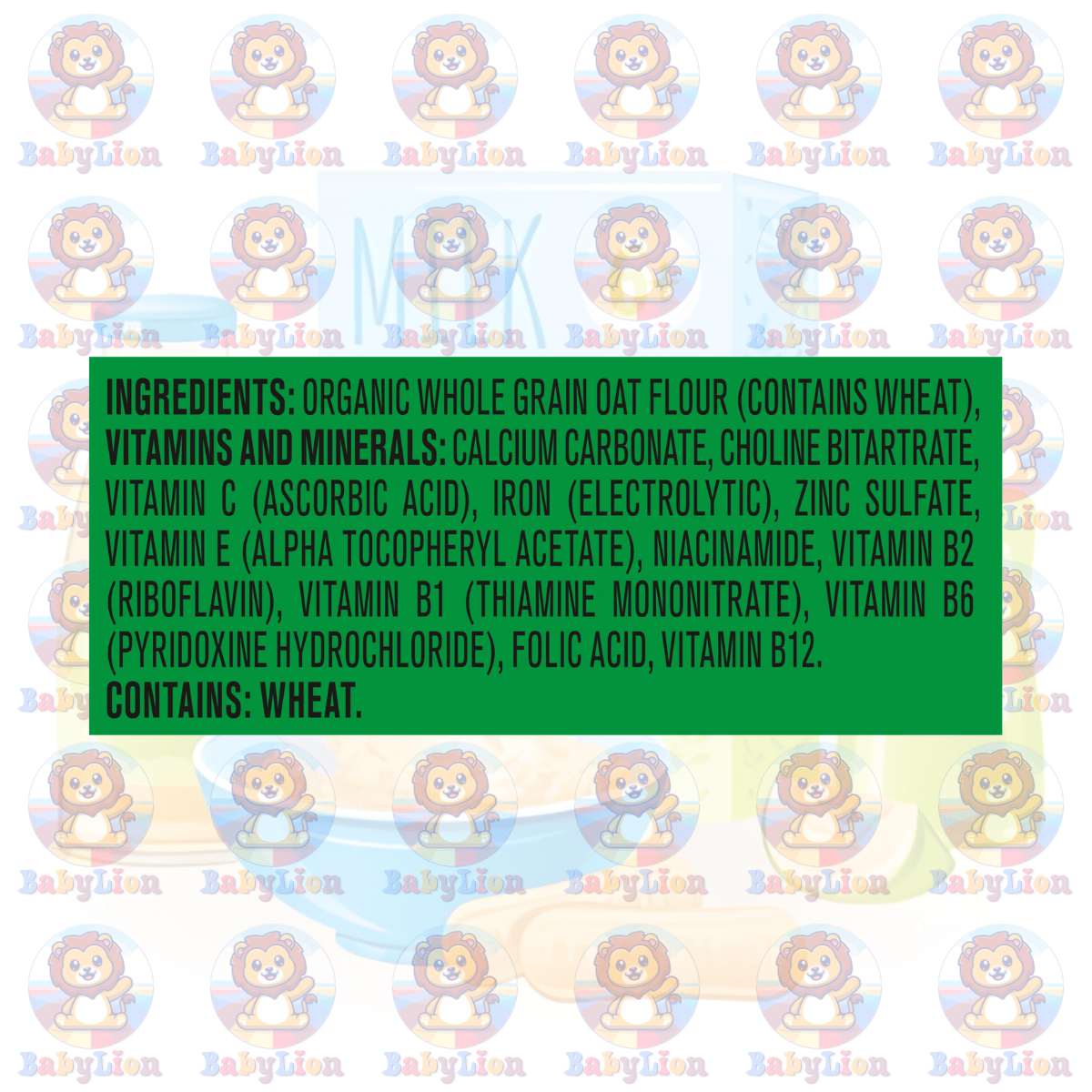 | Ingredients | ORGANIC WHOLE GRAIN OAT FLOUR (CONTAINS WHEAT), VITAMINS AND MINERALS: CALCIUM CARBONATE, CHOLINE BITARTRATE, VITAMIN C (ASCORBIC ACID), IRON (ELECTROLYTIC), ZINC SULFATE, VITAMIN E (ALPHA TOCOPHERYL ACETATE), NIACINAMIDE, VITAMIN B2 (RIBOFLAVIN), VITAMIN B1 (THIAMINE MONONITRATE), VITAMIN B6 (PYRIDOXINE HYDROCHLORIDE), FOLIC ACID, VITAMIN B12. |