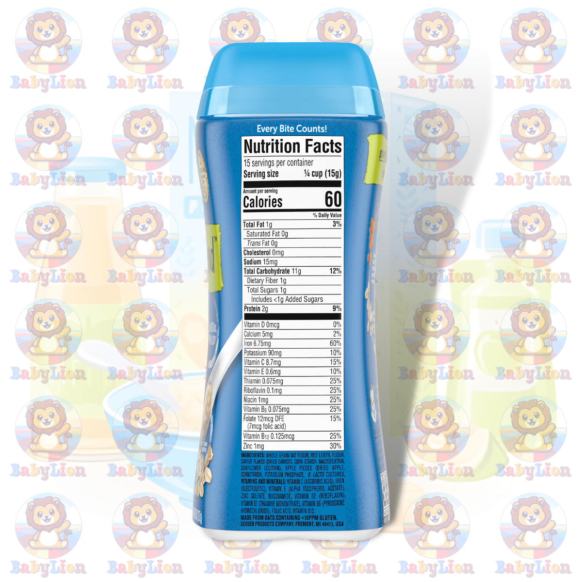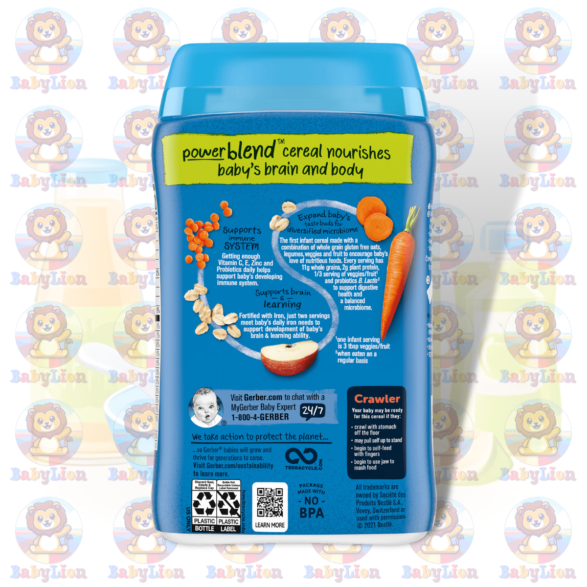 - Complete Nutrition: The Gerber Powerblend Probiotic Oatmeal, Lentil, Carrot & Apple Cereal is designed to provide a balanced blend of nutrients, ensuring your baby receives a comprehensive array of vitamins and minerals in every spoonful.