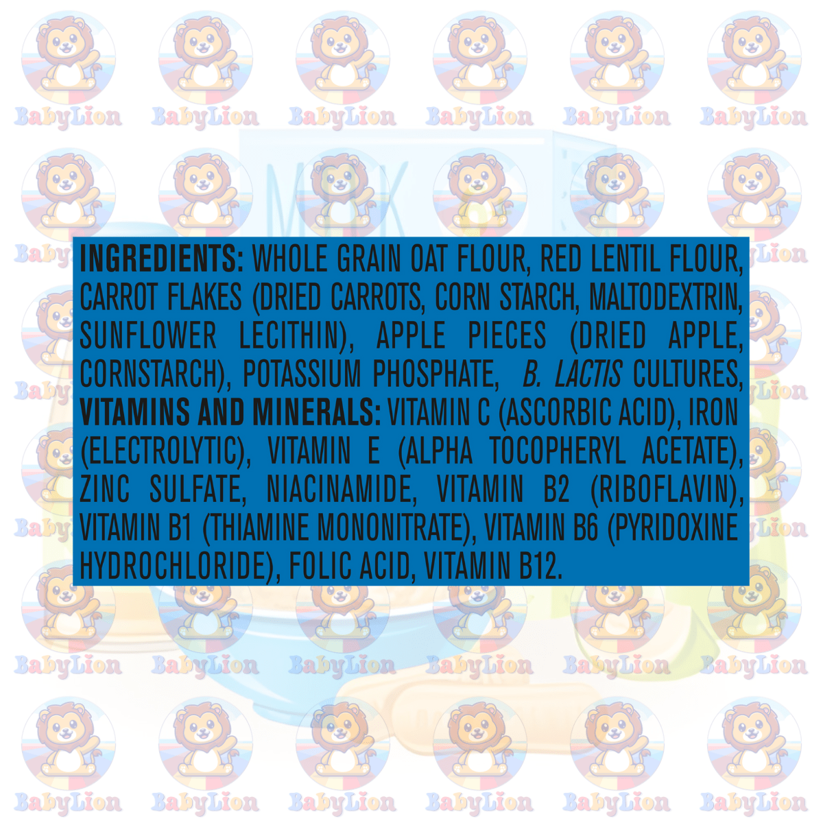 | Ingredients | WHOLE GRAIN OAT FLOUR, RED LENTIL FLOUR, CARROT FLAKES (DRIED CARROTS, CORNSTARCH, MALTODEXTRIN, SUNFLOWER LECITHIN), APPLE PIECES (DRIED APPLE, CORNSTARCH), POTASSIUM PHOSPHATE, B. LACTIS CULTURES, VITAMINS AND MINERALS: CALCIUM CARBONATE, VITAMIN C (ASCORBIC ACID), IRON (ELECTROLYTIC), VITAMIN E (ALPHA TOCOPHERYL ACETATE), ZINC SULFATE, NIACINAMIDE, VITAMIN B2 (RIBOFLAVIN), VITAMIN B1 (THIAMINE MONONITRATE), VITAMIN B6 (PYRIDOXINE HYDROCHLORIDE), FOLIC ACID, VITAMIN B12. |