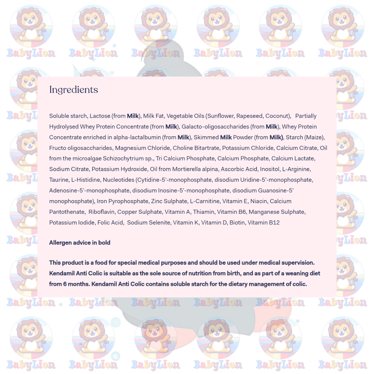 | Ingredients | Soluble starch, Lactose (from Milk), Milk Fat, Vegetable Oils (Sunflower, Rapeseed, Coconut), Partially Hydrolysed Whey Protein Concentrate (from Milk), Galacto-oligosaccharides (from Milk), Whey Protein Concentrate enriched in alpha-lactalbumin (from Milk), Skimmed Milk Powder (from Milk), Starch (Maize), Fructo oligosaccharides, Magnesium Chloride, Choline Bitartrate, Potassium Chloride, Calcium Citrate, Oil from the microalgae Schizochytrium sp., Tri Calcium Phosphate, Calcium Phosphate, Calcium Lactate, Sodium Citrate, Potassium Hydroxide, Oil from Mortierella alpina, Ascorbic Acid, Inositol, L-Arginine, Taurine, L-Histidine, Nucleotides (Cytidine-5’-monophosphate, disodium Uridine-5’-monophosphate, Adenosine-5’-monophosphate, disodium Inosine-5’-monophosphate, disodium Guanosine-5’ monophosphate), Iron Pyrophosphate, Zinc Sulphate, L-Carnitine, Vitamin E, Niacin, Calcium Pantothenate, Riboflavin, Copper Sulphate, Vitamin A, Thiamin, Vitamin B6, Manganese Sulphate, Potassium Iodide, Folic Acid, Sodium Selenite, Vitamin K, Vitamin D, Biotin, Vitamin B12. |
