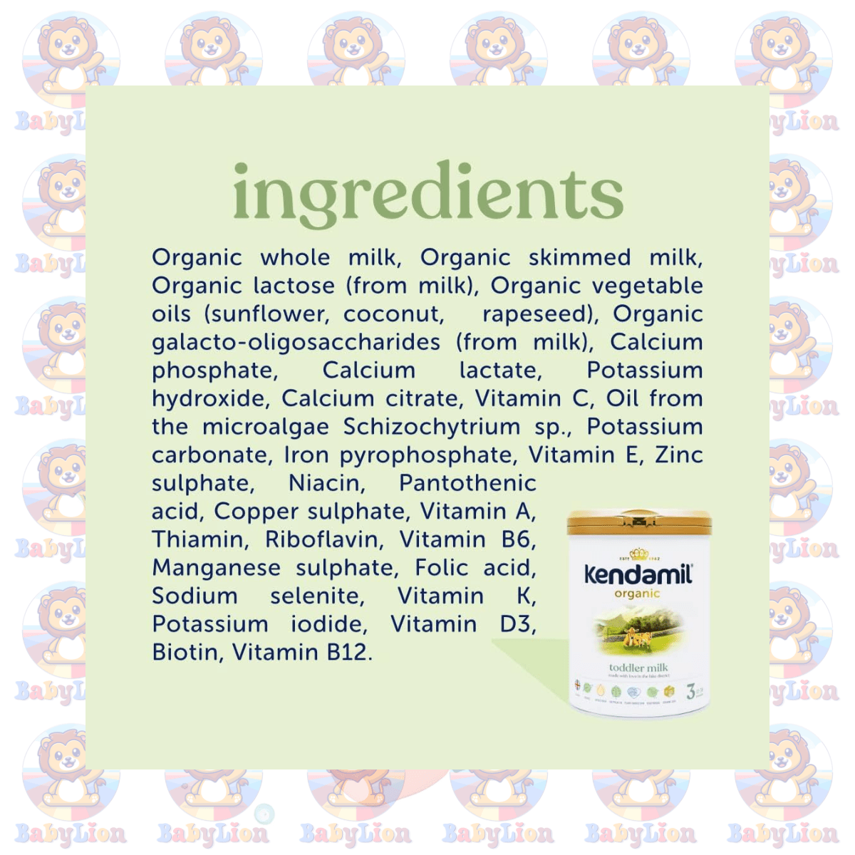 - Rich in Nutrients: Kendamil Organic Stage 3 Toddler Milk contains a blend of vitamins and minerals essential for a toddler's growth and development, from Vitamin A to Iron and Zinc.