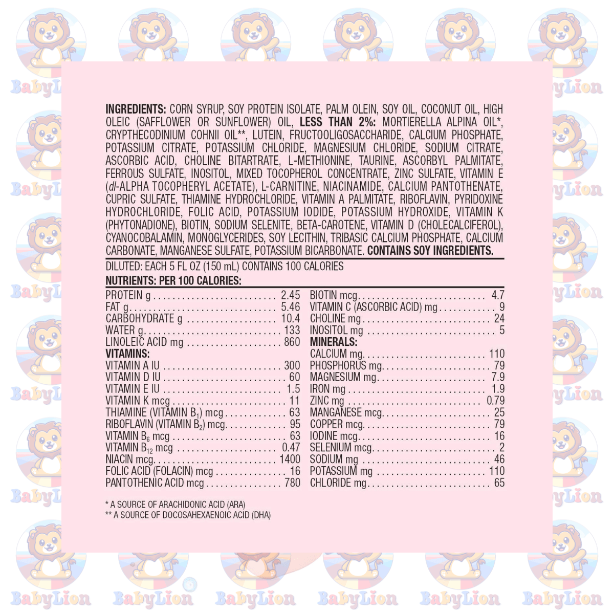| Ingredients | Corn Syrup, Soy Protein Isolate, Palm Olein, Soy Oil, Coconut Oil, High Oleic (Safflower Or Sunflower) Oil, Less Than 2%: Mortierella Alpina Oil*, Crypthecodinium Cohnii Oil**, Lutein, Fructooligosaccharide, Calcium Phosphate, Potassium Citrate, Potassium Chloride, Magnesium Chloride, Sodium Citrate, Ascorbic Acid, Choline Bitartrate, L-Methionine, Taurine, Ascorbyl Palmitate, Ferrous Sulfate, Inositol, Mixed Tocopherol Concentrate, Zinc Sulfate, Vitamin E (dl-Alpha Tocopheryl Acetate), L-CARNITINE, Niacinamide, Calcium Pantothenate, Cupric Sulfate, Thiamine Hydrochloride, Vitamin A Palmitate, Riboflavin, Pyridoxine Hydrochloride, Folic Acid, Potassium Iodide, Potassium Hydroxide, Vitamin K (Phytonadione), Biotin, Sodium Selenite, Beta-Carotene, Vitamin D (Cholecalciferol), Cyanocobalamin, Monoglycerides, Soy Lecithin, Tribasic Calcium Phosphate, Calcium Carbonate, Manganese Sulfate, Potassium Bicarbonate. *A Source Of Arachidonic Acid (ARA) **A Source Of Docosahexaenoic Acid (DHA) |