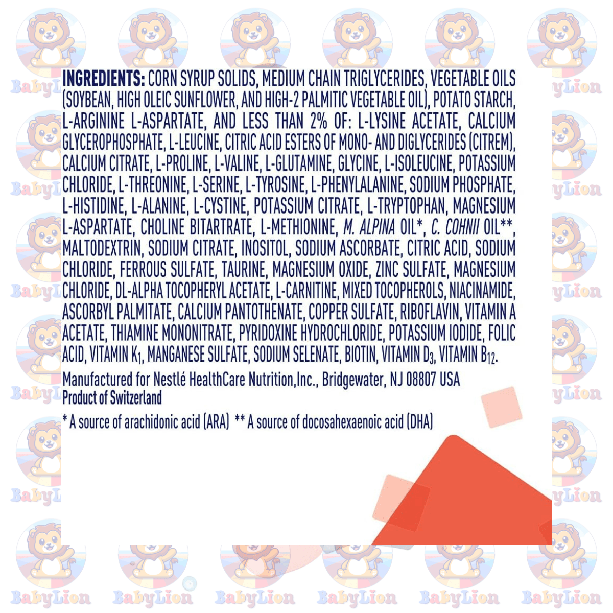 | Ingredients | Corn Syrup Solids, Medium Chain Triglycerides, Vegetable Oils (Soybean, High Oleic Sunflower, and High-2 Palmitic Vegetable Oil), Potato Starch, L-Arginine L-Aspartate, L-Lysine Acetate, Calcium Glycerophosphate, L-Leucine, Citrem, Calcium Citrate, L-Proline, L-Valine, L-Glutamine, Glycine, L-Isoleucine, Potassium Chloride, L-Threonine, L-Serine, L-Tyrosine, L-Phenylalanine, Sodium Phosphate, L-Histidine, L-Alanine, L-Cystine, Potassium Citrate, L-Tryptophan, Magnesium L-Aspartate, Choline Bitartrate, L-Methionine, M. Alpina Oil, C. Cohni Oil, Maltodextrin, Sodium Citrate, Inositol, Sodium Ascorbate, Citric Acid, Sodium Chloride, Ferrous Sulfate, Taurine, Magnesium Oxide, Zinc Sulfate, Magnesium Chloride, DL-Alpha Tocopheryl Acetate, L-Carnitine, Mixed Tocopherols, Niacinamide, Ascorbyl Palmitate, Calcium Pantothenate, Copper Sulfate, Riboflavin, Vitamin A Acetate, Thiamine Mononitrate, Pyridoxine Hydrochloride, Potassium Iodide, Folic Acid, Vitamin K7, Manganese Sulfate, Sodium Selenate, Biotin, Vitamin D3, Vitamin B12 |