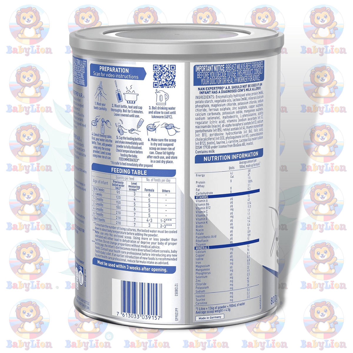 | Ingredients | Enzymatically hydrolysed whey protein (milk), potato starch, vegetable oils, lactose (milk), minerals (calcium phosphate, magnesium chloride, potassium chloride, sodium chloride, ferrous sulphate, zinc sulphate, copper sulphate, calcium carbonate, potassium iodide, manganese sulphate, sodium selenate), maltodextrin, L-phenylalanine, acidity regulator (citric acid), vitamins [sodium ascorbate (vit C), niacinamide (niacin), dl-alpha tocopheryl acetate (vit E), calcium pantothenate (vit B5), retinyl acetate (vit A), thiamin mononitrate (vit B1), pyridoxine hydrochloride (vit B6), folic acid, cholecalciferol (vit D3), phylloquinone (vit K1), cyanocobalamin (vit B12), biotin], taurine, L-carnitine, Lactobacillus reuteri culture (DSM 17938 under license from BioGaia AB), inositol. |