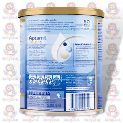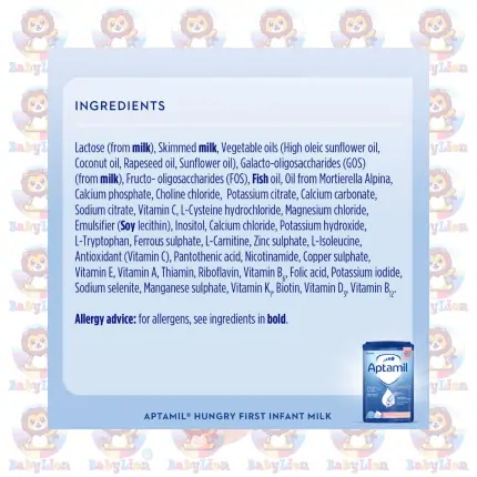 | Ingredients | Milk Solids, vegetable oils, minerals (calcium citrate, sodium phosphate, potassium citrate, potassium chloride, magnesium chloride, potassium phosphate, ferrous sulphate, zinc sulphate, copper sulphate, potassium iodide, sodium selenate), emulsifier (soy lecithin), omega LCPUFAs [DHA from fish oil, AA], acidity regulator (citric acid), oligosaccharide [2’Fucosyllactose (2’FL) (milk)], vitamins [sodium ascorbate (vit C), dl-α-tocopheryl acetate (vit E), calcium pantothenate (vit B5), niacinamide (niacin), thiamin mononitrate (vit B1), retinyl acetate (vit A), pyridoxine hydrochloride (vit B6), riboflavin (vit B2), folic acid, phylloquinone (vit K1), biotin, cholecalciferol (vit D3), cyanocobalamin (vit B12)], L-methionine, L-valine, L-histidine, L-phenylalanine, antioxidants (mixed tocopherols concentrate, ascorbyl palmitate), culture (Bifidobacterium lactis). |