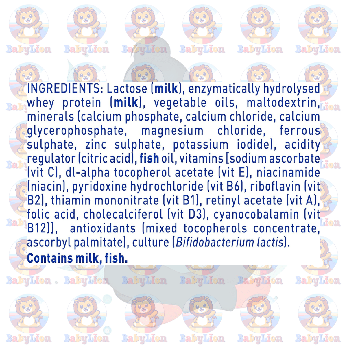 | Ingredients | Lactose (milk), enzymatically hydrolysed whey protein (milk), vegetable oils, maltodextrin, minerals [calcium phosphate, calcium chloride, calcium hydroxide, potassium chloride, ferrous sulphate, zinc sulphate, potassium iodide], acidity regulator (citric acid), fish oil, vitamins [sodium ascorbate (vit C), dl-alpha tocopherol acetate (vit E), niacinamide (niacin), pyridoxine hydrochloride (vit B6), riboflavin (vit B2), thiamin mononitrate (vit B1), retinyl acetate (vit A), folic acid, cholecalciferol (vit D3), cyanocobalamin (vit B12)], antioxidants (mixed tocopherols concentrate, ascorbyl palmitate), culture (Bifidobacterium lactis). |
