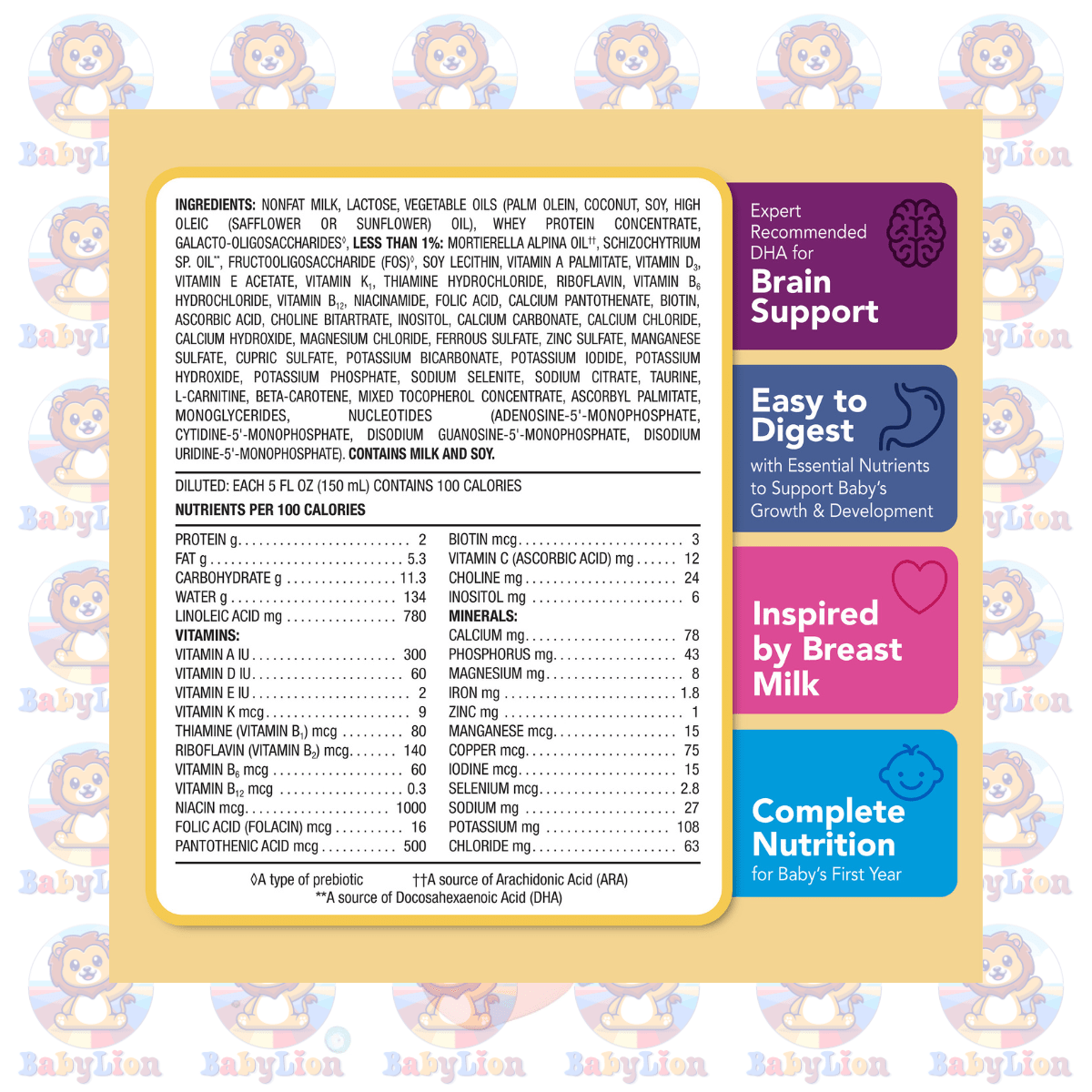 | Ingredients | Nonfat Milk, Lactose, Vegetable Oils (Palm Olein, Coconut, Soy, High Oleic (Safflower or Sunflower) Oil), Whey Protein Concentrate, Galacto-Oligosaccharides, Mortierella Alpina Oil*, Schizochytrium Sp. Oil**, Fructooligosaccharide (FOS), Soy Lecithin, Vitamin A Palmitate, Vitamin D3, Vitamin E Acetate, Vitamin K1, Thiamine Hydrochloride, Riboflavin, Vitamin B6 Hydrochloride, Vitamin B12, Niacinamide, Folic Acid, Calcium Pantothenate, Biotin, Ascorbic Acid, Choline Bitartrate, Inositol, Calcium Carbonate, Calcium Chloride, Calcium Hydroxide, Magnesium Chloride, Ferrous Sulfate, Zinc Sulfate, Manganese Sulfate, Cupric Sulfate, Potassium Bicarbonate, Potassium Iodide, Potassium Hydroxide, Potassium Phosphate, Sodium Selenite, Sodium Citrate, Taurine, L-Carnitine, Beta-Carotene, Mixed Tocopherol Concentrate, Ascorbyl Palmitate, Monoglycerides, Nucleotides (Adenosine-5′-Monophosphate, Cytidine-5′-Monophosphate, Disodium Guanosine-5′-Monophosphate, Disodium Uridine-5′-Monophosphate). *A Source of Arachidonic Acid (ARA). **A Source of Docosahexaenoic Acid (DHA). |