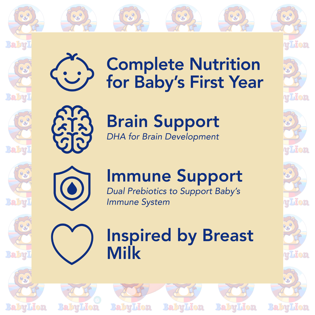 - Cognitive Development:Â Contains DHA and ARA, essential fatty acids that contribute to the cognitive development and the healthy development of the eyes in infants.