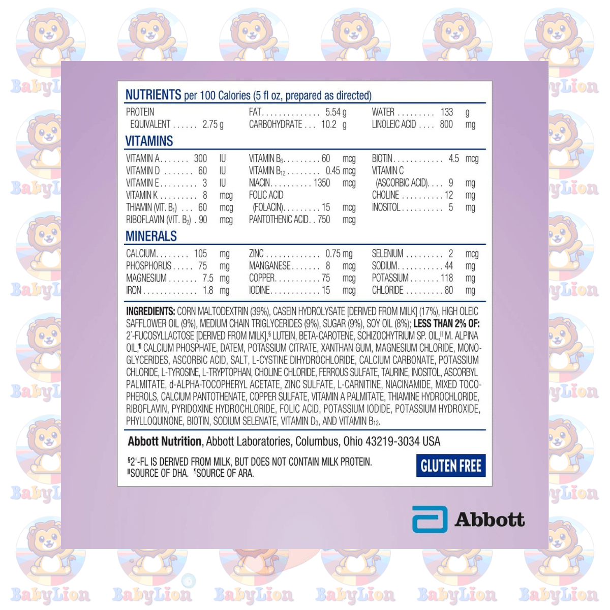 | Ingredients | CORN MALTODEXTRIN, CASEIN HYDROLYSATE, HIGH OLEIC SAFFLOWER OIL, MEDIUM CHAIN TRIGLYCERIDES, SUGAR, SOY OIL, 2′-FUCOSYLLACTOSE, LUTEIN, BETA-CAROTENE, SCHIZOCHYTRIUM SP. OIL, M. ALPINA OIL, CALCIUM PHOSPHATE, DATEM, POTASSIUM CITRATE, XANTHAN GUM, MAGNESIUM CHLORIDE, MONOGLYCERIDES, ASCORBIC ACID, SALT, L-CYSTINE DIHYDROCHLORIDE, CALCIUM CARBONATE, POTASSIUM CHLORIDE, L-TYROSINE, L-TRYPTOPHAN, CHOLINE CHLORIDE, FERROUS SULFATE, TAURINE, INOSITOL, ASCORBYL PALMITATE, d-ALPHA-TOCOPHERYL ACETATE, ZINC SULFATE, L-CARNITINE, NIACINAMIDE, MIXED TOCOPHEROLS, CALCIUM PANTOTHENATE, COPPER SULFATE, VITAMIN A PALMITATE, THIAMINE HYDROCHLORIDE, RIBOFLAVIN, PYRIDOXINE HYDROCHLORIDE, FOLIC ACID, POTASSIUM IODIDE, POTASSIUM HYDROXIDE, PHYLLOQUINONE, BIOTIN, SODIUM SELENATE, VITAMIN D3, VITAMIN B12. |