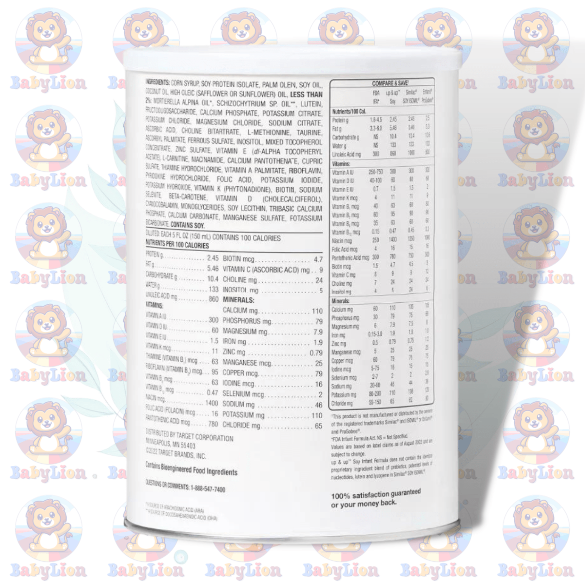 - Complete Soy Nutrition: The Up & Up Soy Infant Formula offers balanced nutrition similar to Similac Soy Isomil and Enfamil ProSobee, ideal for infants from birth to 12 months who require soy-based nourishment.